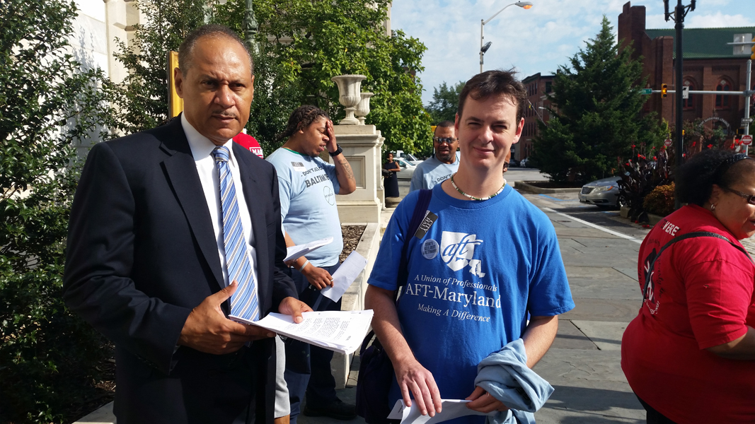 Approximately 75 activists from AFT-Maryland, the City Union of Baltimore, AFSCME Council 67, and UNITE HERE Local 7 rallied at City Hall last Wednesday morning, 8/13/14, citing concerns the city was planning to privatize the public water system.