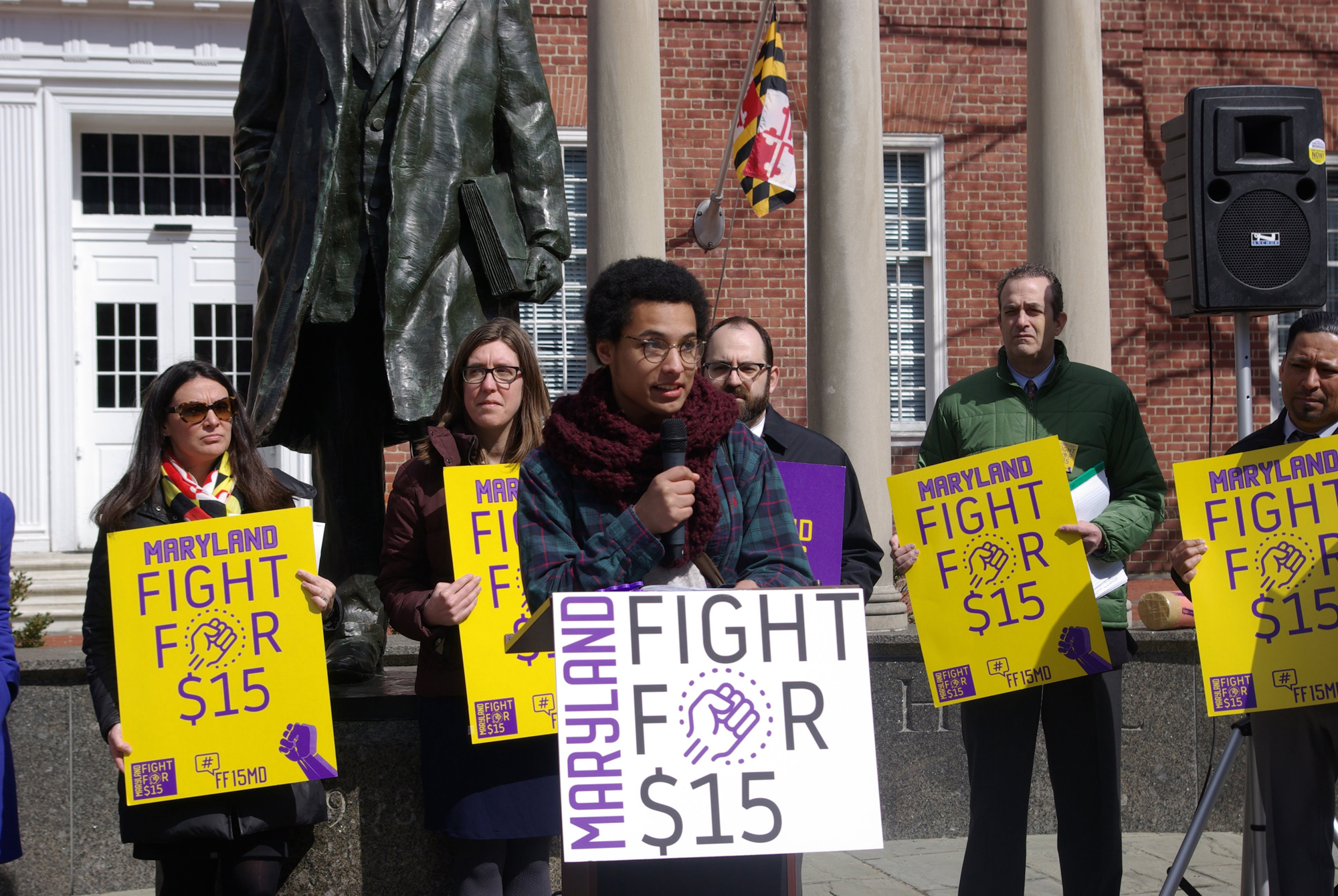 On Thursday, March 8, 2018, the Maryland Fight for 15 Coalition held a press conference in advance of a hearing in the Maryland state Senate. The press conference was attended by a number of elected officials including Sen. Ron Young of Frederick and Del. Jazz Lewis of Prince George’s County. Baltimore City Councilman Kristerfer Burnett was also in attendance at the press conference and testified later that day at the Senate hearing. He remarked he was there to call for a $15 minimum wage because “poverty is violence.”