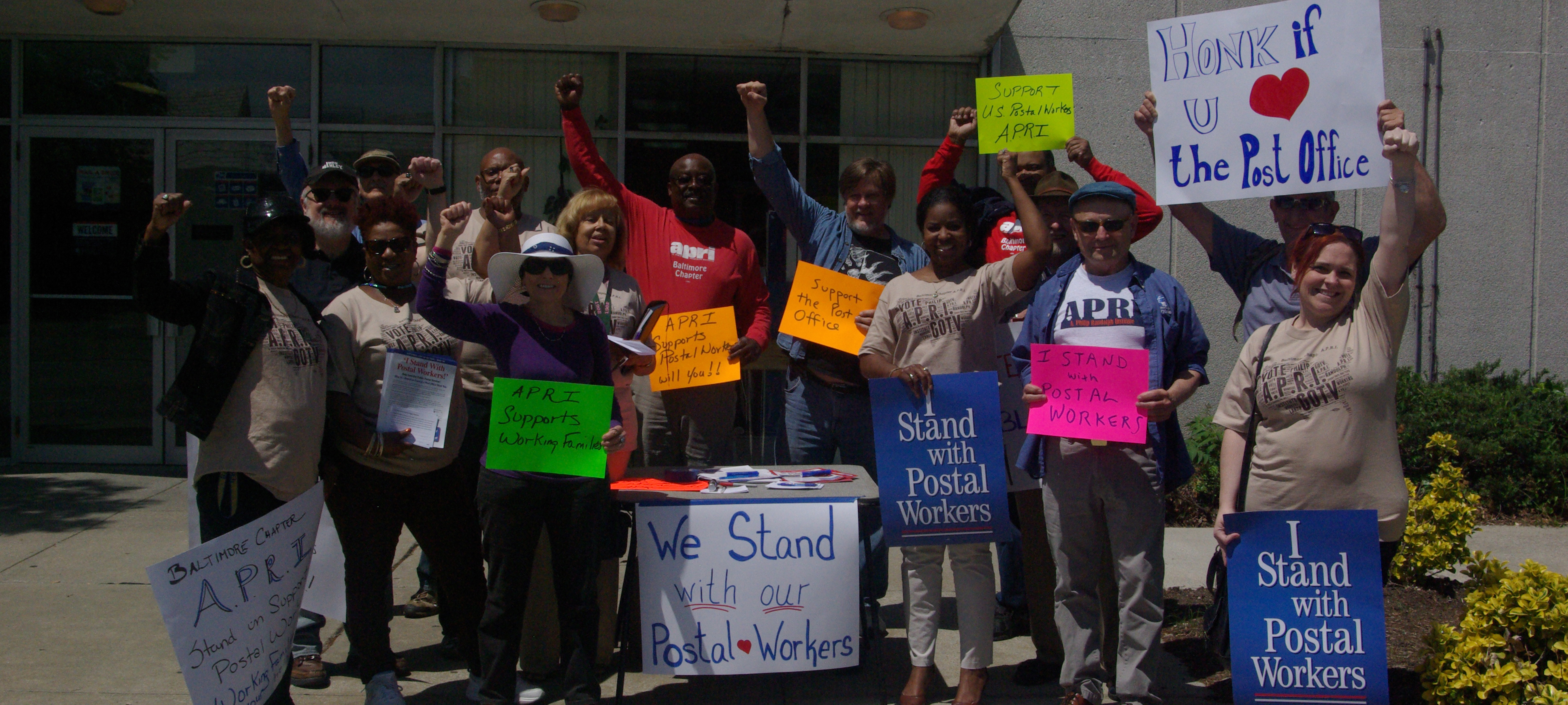 Members of AFT-Maryland turned out in a show of solidarity to stand with AFL-CIO sisters and brothers of the American Postal Workers Union (APWU). The show of force was to protest to privatization of postal service, as the USPS has a deal with Staples where they provide mailing service to customers costing numerous APWU members jobs.
