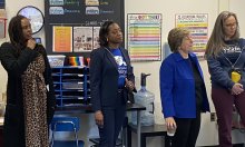 Randi Weingarten was grateful to be amongst Maryland AFT union leaders as she referenced the respective state federation and local presidents as “Sister Campbell” and “Sister Brown”. Beyond that, Weingarten remarked on the union leadership visiting a school that is successful and a place that “parents want to send their kids, educators want to work, that kids thrive… Wolfe [Street] is not an easy neighborhood. We’ve got lots of challenges here and this is a school that meets those challenges.” Meeting the challenge is something that faculty and staff of Wolfe Street Academy do day in and day out. Supporting that work is a source of pride for BTU president Diamonté Brown. She was ecstatic that all three leaders could come together to support community schools and “to acknowledge the work many of our community schools have already done.” President Brown also observed the spotlight on Wolfe Street Academy and community schools in Baltimore as “a great acknowledgement of the work that many of [her] predecessors have already done to pave the way for us to have the community schools we have today.”